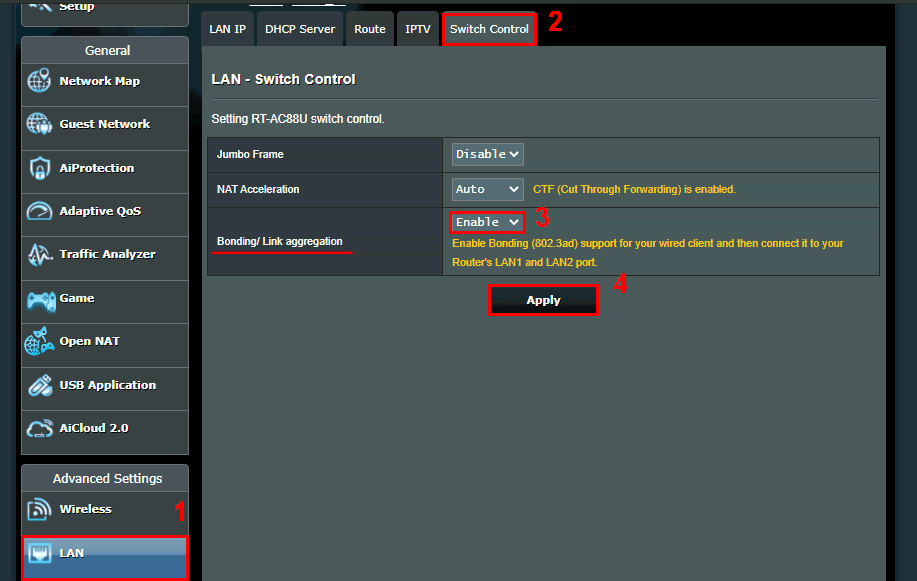 Nell’immagine, la creazione di un LAG sulle porte LAN1 e LAN2 di un router ASUS. Per procedere, basta accedere alla sezione LAN (1), selezionare la scheda Controllo switch (2), attivare la voce evidenziata in figura (3) e infine cliccare su Applica (4).