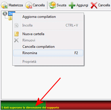 La lunghezza della banda di colore rosso indica di quanto i dati in eccesso superano la capienza del supporto inserito.