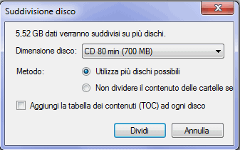 Facendo clic su Suddivisione disco, si potrà fare in modo che i file e le cartelle da masterizzare, scelti in precedenza, vengano scritti su più supporti.