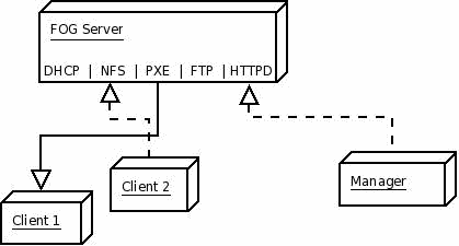 Quella indicata con la dizione “manager” è la macchina dalla quale si effettua l’amministrazione delle workstation connesse alla LAN. Se il server FOG è installato su un sistema Ubuntu Linux, ad esempio, il “manager” può essere un utente collegato localmente al server oppure ad un’altra macchina della rete locale (egli dovrà collegarsi al server digitando l’URL http://192.168.1.50/fog/management/ ove 192.168.1.50 deve essere sostituito con l’IP o col nome della macchina Linux server.