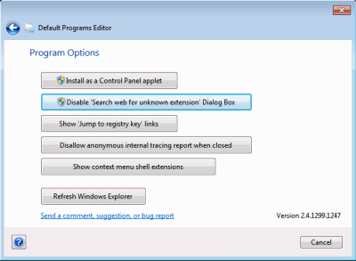 DefaultPrograms è un software gratuito che mette a disposizione dell’utente un più ampio spettro di possibilità. Non solo si possono modificare le associazioni estensione-programma ma intervenire sulle icone delle varie tipologie di file, sulle voci del menù contestuale (il menù che compare cliccando con il tasto destro del mouse, ad esempio, su di un qualsiasi file), sul comportamento della funzionalità “autorun”.
