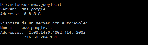 Nell’esempio, il DNS Google (ma potrebbe essere quello dell’operatore di telecomunicazioni, quello di Cloudflare, di OpenDNS,…) restituisce due indirizzi IP pubblici: un IPv6 e un IPv4. Il messaggio Risposta da un server non autorevole è del tutto corretto perché la risoluzione del nome di dominio specificato è effettuata da un server DNS che non è quello utilizzato dal gestore del sito Web indicato (server autoritativo).
