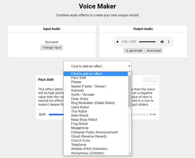 Voice Changer è un’applicazione Web che permette di intervenire su una registrazione vocale acquisita cliccando su Use microphone oppure caricata come file audio (pulsante Upload audio).
