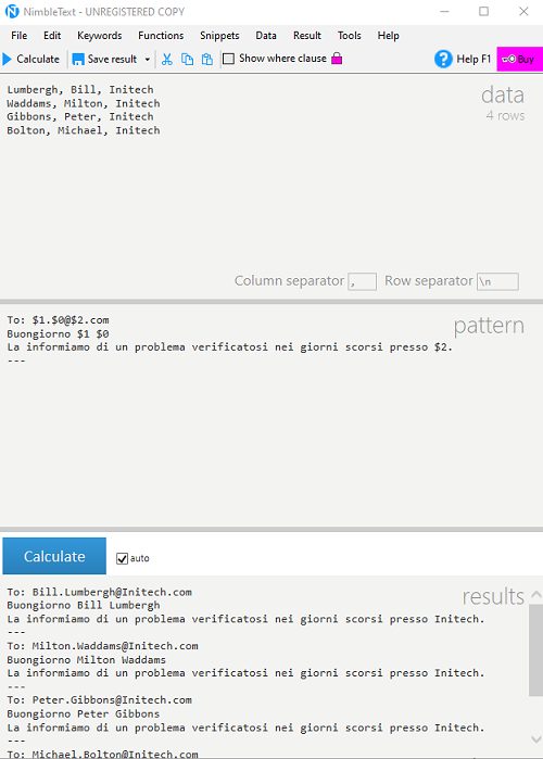 Diversamente rispetto alle regular expression usare NimbleText è molto semplice: basta incollare il testo da elaborare nel riquadro Data, specificare la struttura del testo che si desidera ottenere nell’area Pattern quindi fare clic sul pulsante Calculate.
