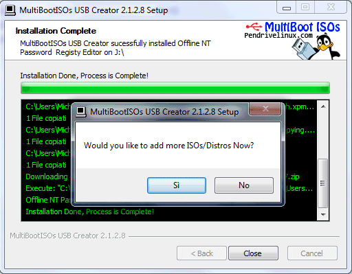 La successiva finestra, invece, contenente un riquadro a sfondo nero con i caratteri di colore verde, riassume tutti i passaggi via a via effettuati da MultiBootISOs. Alla comparsa del messaggio Would you like to add more ISOs/Distros Now?, si può rispondere affermativamente nel caso in cui si voglia aggiungere altri strumenti od altre distribuzioni Linux all’interno della chiavetta USB avviabile.