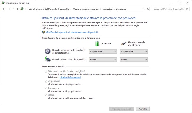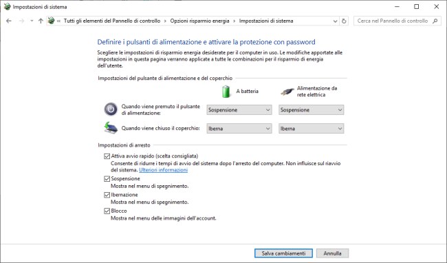 Avete bambini piccoli che girano per casa? Per evitare che spengano il PC toccando il pulsante di alimentazione si può scegliere Specifica comportamento pulsanti di alimentazione quindi impostare Non intervenire sia per Quando viene premuto il pulsante di alimentazione che per Quando viene premuto il pulsante di sospensione.