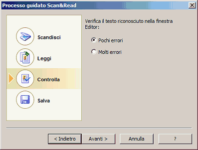 Anziché fruire della procedura automatica per il riconoscimento dei documenti (Scan&Read), è possibile sovrintendere manualmente tutte le quattro fasi agendo sugli appositi pulsanti Scandisci, Leggi, Controllo ortografico e Salva posizionati nella barra degli strumenti del programma.