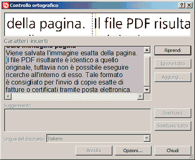 Cliccando su Sì, l’utente ha poi modo di controllare la corretta interpretazione di tutte le parole sulle quali FineReader si è trovato in difficoltà durante la scansione. Il dizionario proposto permetterà di selezionare immediatamente i termini corretti.