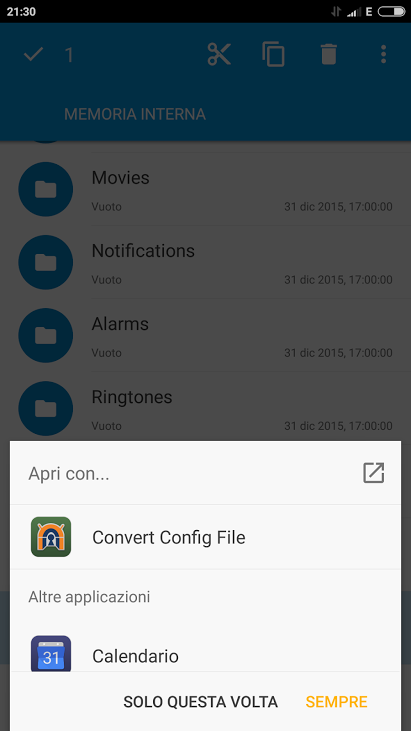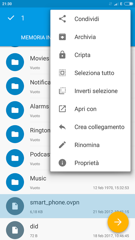Il file smart_phone.ovpn dovrà essere estratto dal file compresso .zip e manualmente copiato nella memoria interna o nella scheda SD del dispositivo mobile Android.