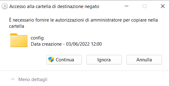 Copiando nella cartella il file .ovpn compare il messaggio Accesso alla cartella di destinazione negato. Per proseguire basta fare clic su Continua.