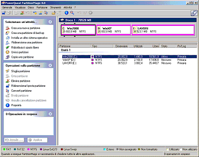 La finestra principale propone, nella colonna di sinistra, la lista di tutte le operazioni possibili con PartitionMagic 8.0. Rispetto al passato è quindi molto più semplice effettuare modifiche alle partizioni presenti sul disco fisso.