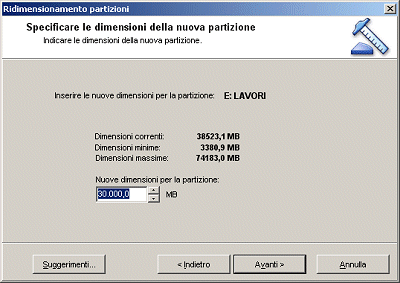 Qualora le partizioni attualmente presenti sul disco fisso occupino già tutto lo spazio a disposizione, la procedura guidata consentirà di ridimensionare opportunamente le partizioni già presenti per fare spazio a quella nuova. E’ infatti possibile indicare da quali partizioni si desidera recuperazione dello spazio libero da destinare alla creazione della nuova partizione.