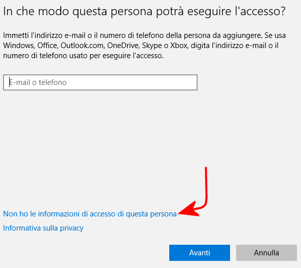 Nella finestra che comparirà, bisognerà astenersi dall’indicare qualsiasi indirizzo email e bisognerà invece fare clic su Non ho le informazioni di accesso di questa persona.