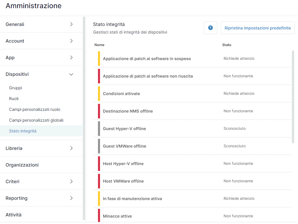 NinjaOne dispone di una lista di possibili stati del dispositivo, eventualmente personalizzabile. Tra questi stati ci sono anche le informazioni di integrità relative al processo di patching: il sistema indica ad esempio se ci sono aggiornamenti la cui installazione risulta in sospeso o non è andata a buon fine.