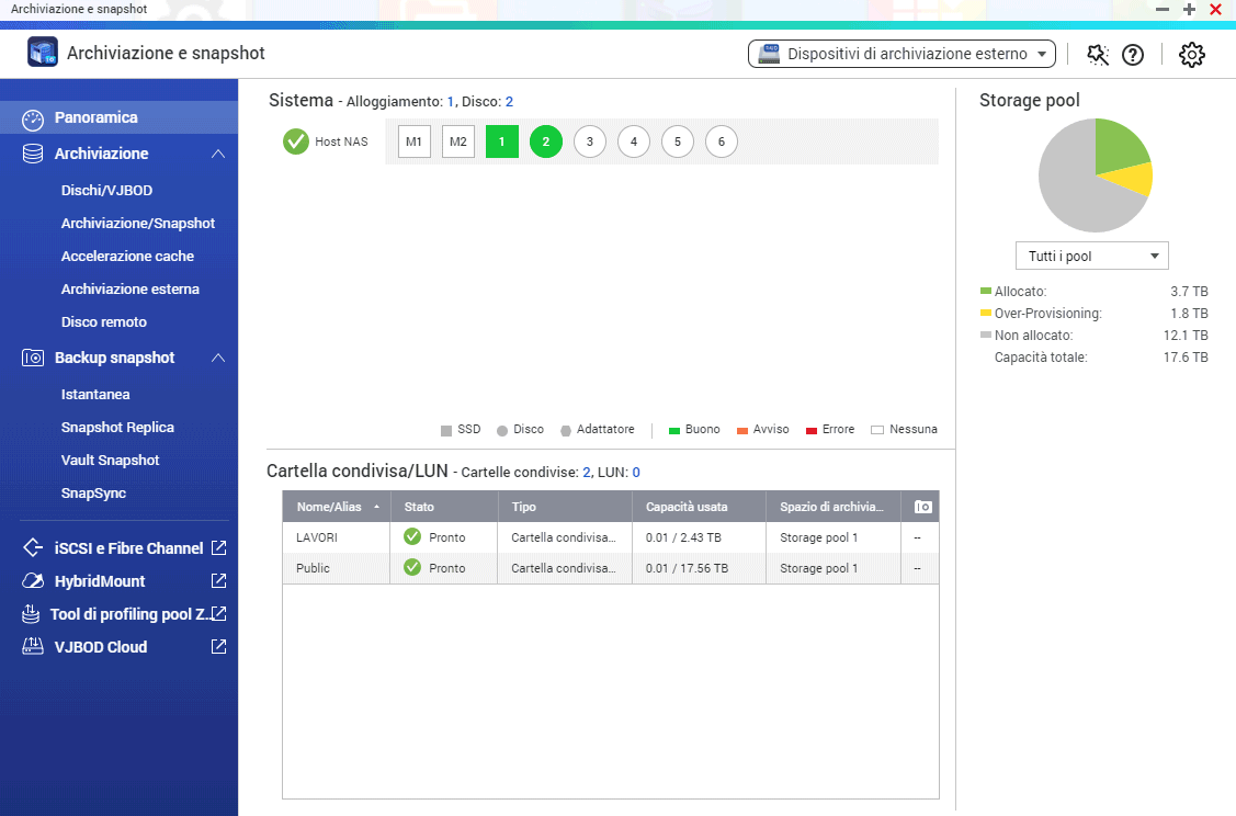 Nella sezione Archiviazione e snapshot di QTS si possono gestire i volumi; agendo sulla stessa icona con QuTS hero, invece, si può lavorare sulle cartelle e su ciascuna di esse è possibile abilitare compressione e deduplicazione. La differenza è evidente già esaminando la schermata Panoramica: QTS presenta la lista dei volumi presenti mentre QuTS hero, l’elenco delle cartelle.