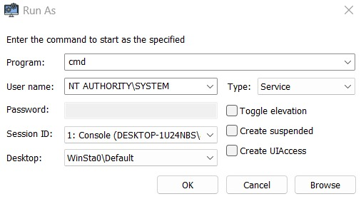 Torniamo su System Informer quindi scegliamo di nuovo System, Run as, e scriviamo semplicemente cmd nel campo Program. Lasciamo selezionato NT AUTHORITY\SYSTEM nel sottostante menu a tendina User name.