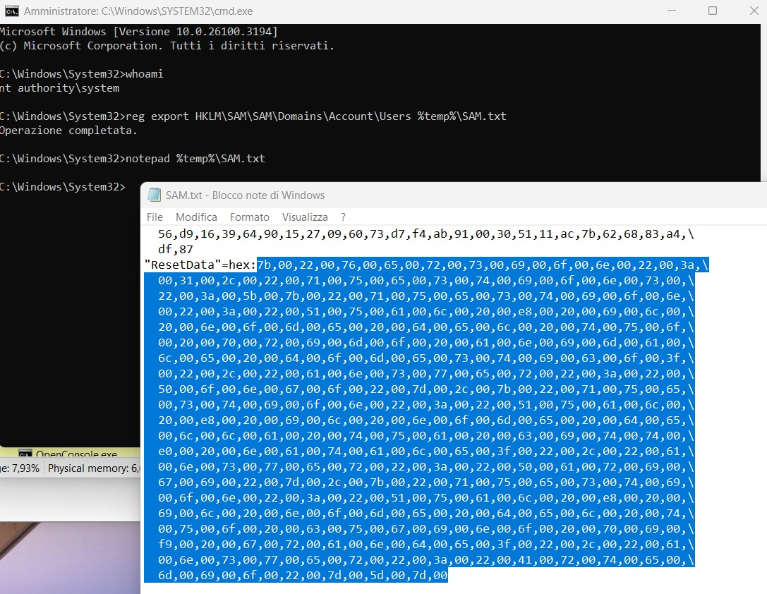 Il problema principale risiede che domande di sicurezza e risposte sono memorizzate come testo in chiaro all’interno del registro di sistema di Windows. Più precisamente, queste informazioni sono contenute in un file JSON all’interno della chiave SAM (Security Account Manager). SAM è una sottochiave del registro che contiene tutte le informazioni sugli utenti e sui gruppi di un sistema Windows locale.