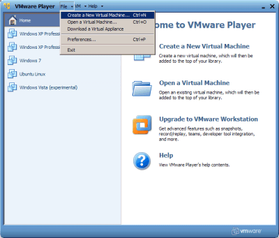 VMware Player 3.0, innanzi tutto, colma il divario rispetto ai software concorrenti come Sun Virtualbox mettendo a disposizione gli strumenti necessari per creare e gestire macchina virtuali di ogni genere. Sino alla versione 2.x di VMware Player, infatti, all’utente non era concessa la possibilità di creare nuove “virtual machine”: si potevano aprire ed eseguire macchine virtuali generate con i prodotti VMware di “fascia” superiore oppure si poteva applicare un espediente, basato sull’uso del programma “VMmanager” (ved. questi articoli), per produrre i file di base necessari per l’avvio di una nuova macchina virtuale e la successiva installazione del sistema operativo “guest”.