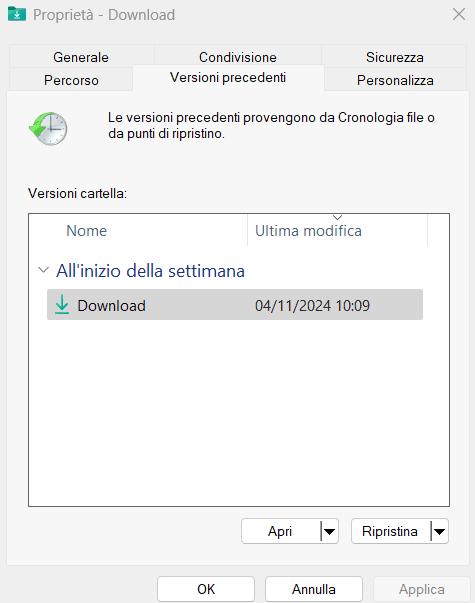 Con l’attivazione di Ripristino configurazione di sistema, si attiva automaticamente anche Versioni precedenti. Cliccando con il tasto destro del mouse sul nome di una cartella da Esplora file (Windows+E), scegliendo Proprietà quindi la scheda Versioni precedenti, è possibile accedere al contenuto della directory, così come si presentava nel momento della creazione del punto di ripristino. Cliccate su Apri per “navigare” la struttura della cartella selezionata.
