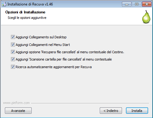 All’avvio dell’installazione di Recuva, il programma mostra subito la nuova funzionalità Aggiungi scansione cartella per file cancellati al menù contestuale. Lasciando spuntata la casella corrispondente, Recuva configurerà Windows in modo tale che cliccando con il tasto destro del mouse su una qualsiasi cartella, sia disponibile il comando per il recupero dei file cancellati.