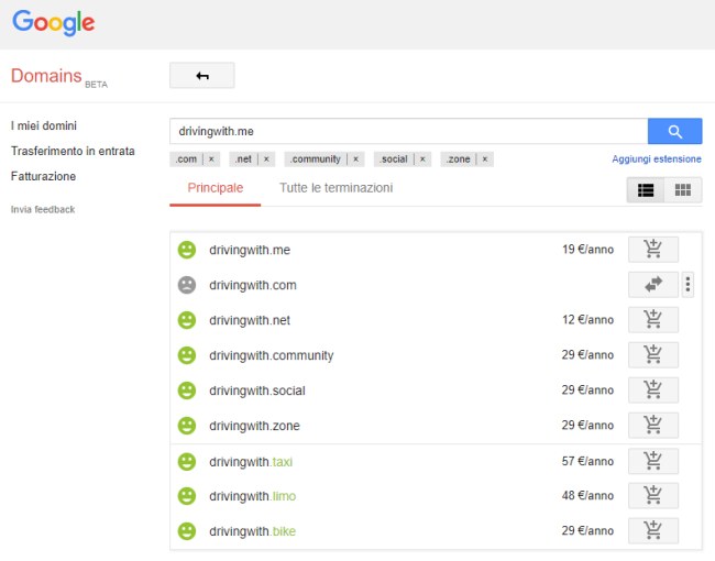 Google indica se il dominio d’interesse può essere registrato e il costo della registrazione annuale in euro.