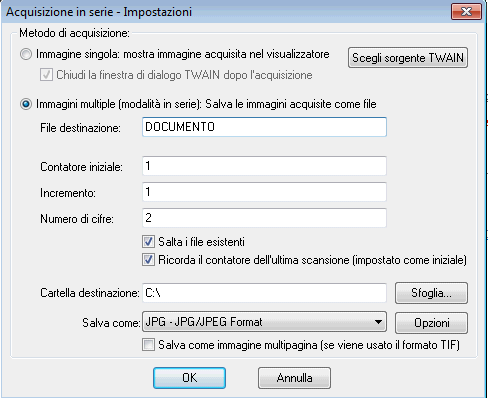 La finestra che apparirà a video consenterà di scegliere se limitarsi ad acquisire una sola pagina (Immagine singola, mostra immagine acquisita nel visualizzatore) oppure un insieme di esse (Immagini multiple (modalità in serie)).