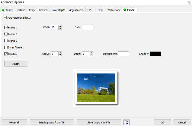 La scheda Border, per esempio, consente di aggiungere un bordo a ciascuna immagine. Il bordo può essere esterno (stile Polaroid), interno, si possono attivare ombreggiature e diversi effetti grafici su linee e forme.
