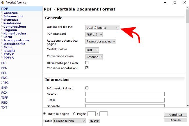 Eventualmente si può sostituire default/medium con default/good o default/low per ottenere rispettivamente PDF in qualità buona (300 DPI) o bassa (96 DPI).