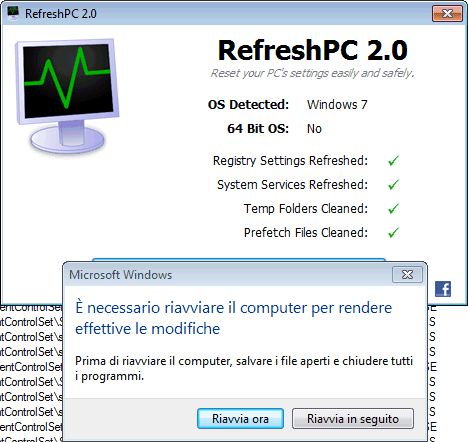 Un riavvio del sistema operativo è sempre necessario per rendere efficaci tutte le modifiche applicate da RefreshPC: