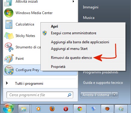 Suggeriamo di eliminare la voce Configure Prey dal pulsante Start di Windows (tasto destro Rimuovi da questo elenco) cancellando eventualmente anche l’intero gruppo Prey dal menù Programmi del sistema operativo.