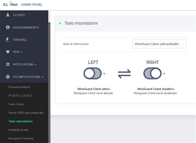 La configurazione è semplicissima: dal pannello di amministrazione (il router ha per default IP 192.168.8.1) basta cliccare su VPN nella colonna di sinistra quindi fare clic su OpenVPN server oppure su WireGuard Server per attivare un server VPN con un solo clic.