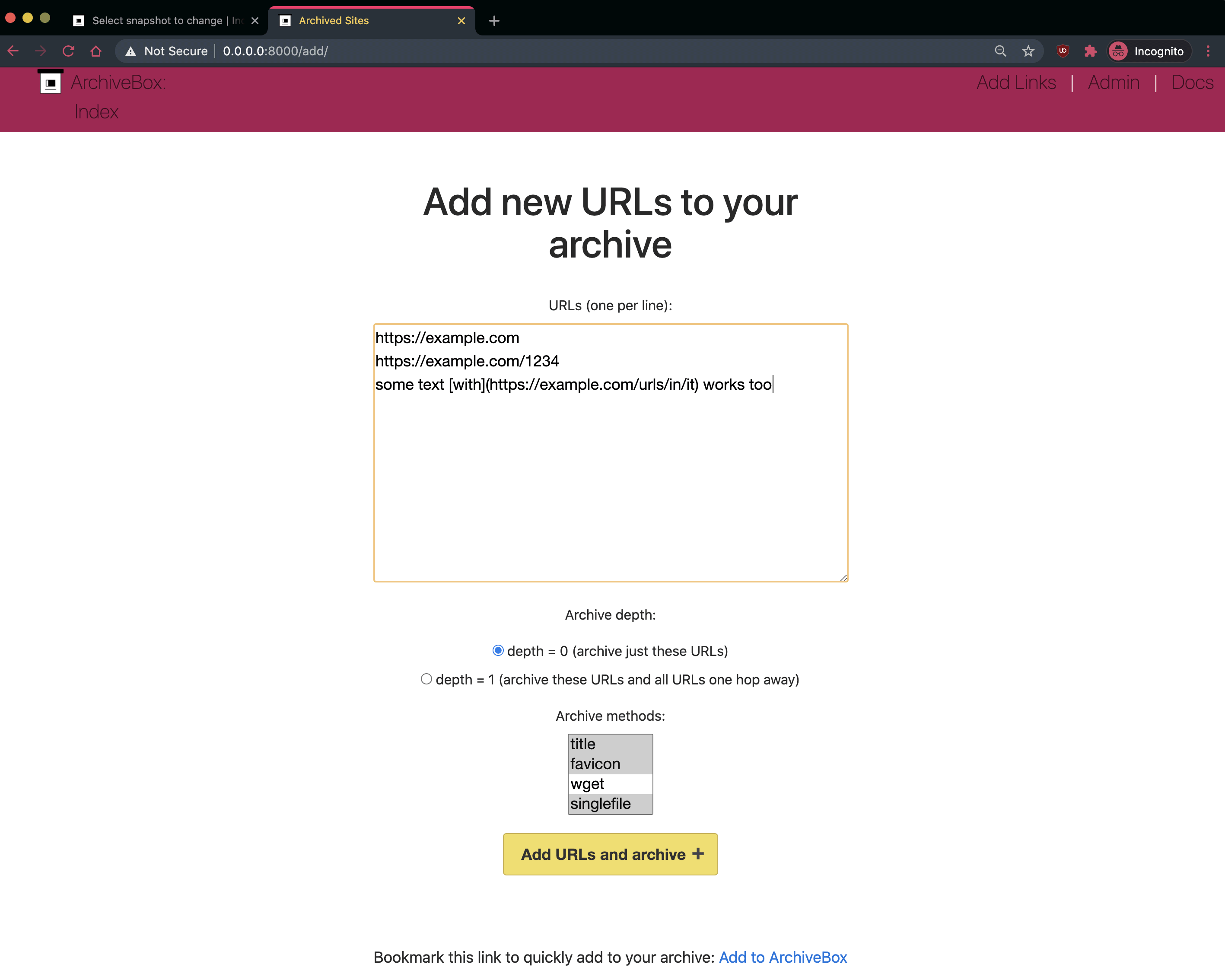 L’applicazione consente di specificare un singolo URL della pagina da memorizzare oppure inserire, uno per riga, più indirizzi separati. In questo modo ArchiveBox crea una copia di tutte le pagine specificate. Impostando 0 come profondità (depth), ArchiveBox acquisisce solo il contenuto di ciascun URL indicato; diversamente si può chiedere all’applicazione di seguire tutti i link presenti in pagina (limitandosi a un solo livello).