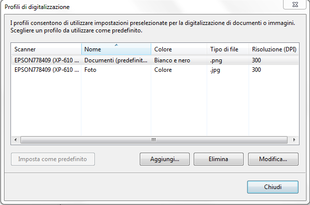 Il pulsante Imposta come predefinito consente di impostare come predefinito il profilo scelto per la scansione dei documenti o delle foto.