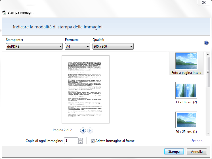 A questo punto si aprirà la finestra Stampa immagini di Windows. Per i documenti normali, suggeriamo scegliere la voce Foto a pagina intera ed accertarsi come come stampante sia selezionata doPDF.