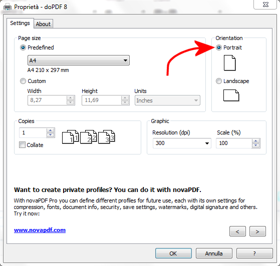 Per fare in modo di avere tutte le pagine del PDF in verticale, bisognerà quindi aver cura di selezionare Portrait.