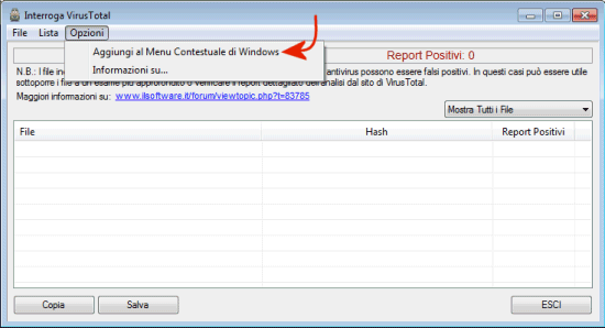 Da qui, cliccando sul menù Opzioni quindi sulla voce Aggiungi al menù contestuale di Windows, il programma provvederà ad inserire automaticamente il comando “Invia l’Hash del file a VirusTotal” nel menù “Invia a” di Windows.