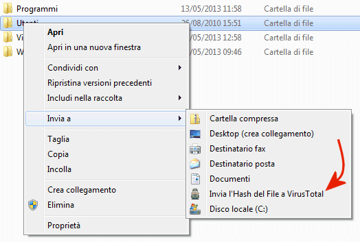 Ciò significa che selezionando uno o più file e cartelle da Esplora risorse, cliccandovi con il tasto destro del mouse, quindi selezionando Invia a, Invia l’Hash del file a VirusTotal, si avvierà immediatamente il controllo antimalware: