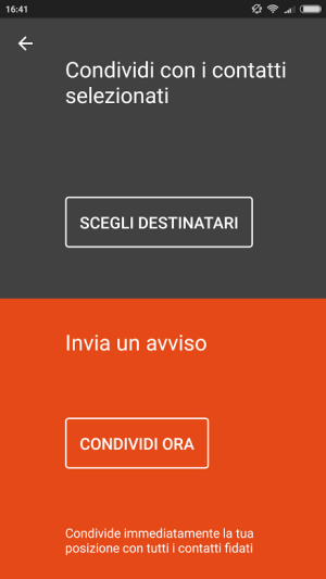 Il pulsante in alto a destra (di colore arancione) permetterà di disporre l’invio della propria posizione solo ad alcuni contatti fidati (Scegli destinatari) oppure di notificarla a tutti i contatti precedentemente impostati come fidati.