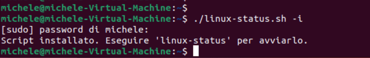 Avviando lo script come ./linux-status.sh -i, il suo contenuto è copiato nella directory /usr/local/bin con il nome linux-status. Dopo aver digitato la password root, per eseguire lo script da qualunque locazione di memoria, d’ora in avanti basta semplicemente digitare linux-status e premere Invio.