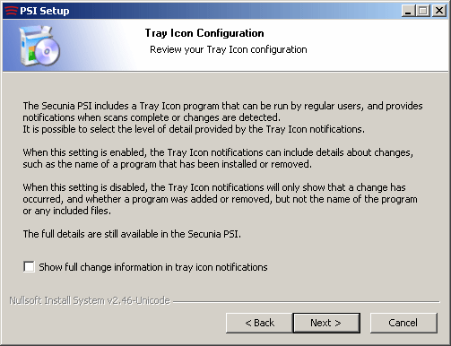 La finestra successivamente esposta durante la procedura d’installazione di PSI 2.0 (“Tray Icon Configuration“), richiede all’utente se desideri o meno ricevere informazioni dettagliate circa le applicazioni a proposito delle quali vi sono delle novità, ad esemio l’aggiunta o la rimozione di un programma dall’elenco dei software monitorati.