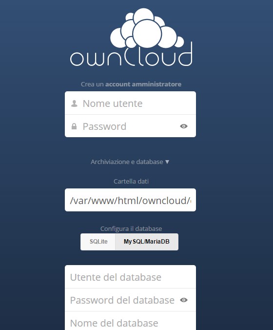 Prima di passare alla configurazione vera e propria di ownCloud, si dovrà innanzi tutto impostare il DBMS MariaDB: