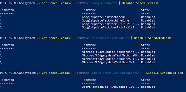 Get-ScheduledTask -TaskName "MicrosoftEdgeUpdate*" | Disable-ScheduledTask