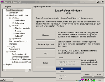 4. Cliccando con il tasto destro del mouse sull’icona di SpamPal quindi su Stato è possibile ottenere una serie di informazioni statistiche sul numero dei messaggi identificati come spam, sulle interrogazioni effettuate sui database antispam (black list) e così via.