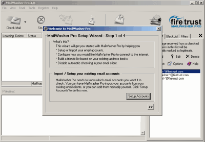 MailWasher è un software che si è guadagnato da tempo fama di ottimo strumento nella lotta contro lo spam. Inizialmente nato come freeware, quindi come shareware (la versione 2.0, finché non si fosse provveduto alla registrazione a pagamento, limitava i suoi servizi ad una sola casella di posta), MailWasher è stato acquisito da Firetrust che oggi ne commercializza la quarta versione. Il programma (a differenza, ad esempio, di Spamihilator) non preleva le e-mail ma effettua un controllo sul server di posta, prima ancora di scaricare i messaggi. Per ciascun messaggio presente in mailbox, MailWasher ne evidenzia chiaramente il contenuto indicando le e-mail sospette. Il software non è limitato in alcuna funzione ma cessa di operare dopo 30 giorni di utilizzo. MailWasher 4 risulta molto simile alla ormai ampiamente conosciuta precedente versione 2.0. L’interfaccia grafica, tuttavia, è stata ampiamente rivista e sono state introdotte numerose funzioni aggiuntive per il riconoscimento automatico delle e-mail di spam.