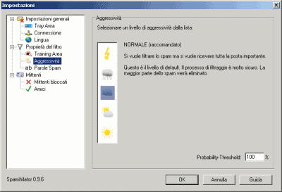 Il Word filter è un filtro che si basa sul riconoscimento delle parole che sono presenti con maggior frequenza nei messaggi di spam: Spamihilator dispone di un ampio database contenente tutti i termini più utilizzati. Sappiate comunque che tale “dizionario” è liberamente personalizzabile (cliccate con il tasto destro sull’icona di Spamihilator nella traybar, selezionate Impostazioni quindi Parole spam). Il Learning filter riconosce, invece, anche le parole che vengono usate nei messaggi che non contengono spam: ad ogni parola viene associata una certa probabilità. Tale filtro può essere “istruito” nel senso che, qualora il programma non riconosca automaticamente una o più e-mail di spam, è possibile indicarle manualmente migliorando notevolmente le sue abilità (cliccate col tasto destro del mouse sull’icona del programma quindi su Training area: evidenziate il messaggio “incriminato” e fate clic sul pulsante Spam).