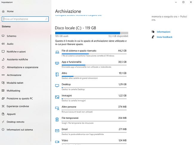 Partiamo da Windows 10 e dallo strumento che il sistema operativo integra di per sé: si chiama Archiviazione ed è accessibile digitando Impostazioni di archiviazione nella casella di ricerca del sistema operativo. Con un clic su Mostra altre categorie si otterrà una grossolana distinzione che fotografa come viene occupato lo spazio dal sistema operativo, dalle applicazioni installate, dagli elementi salvati nelle varie cartelle di sistema e così via.
