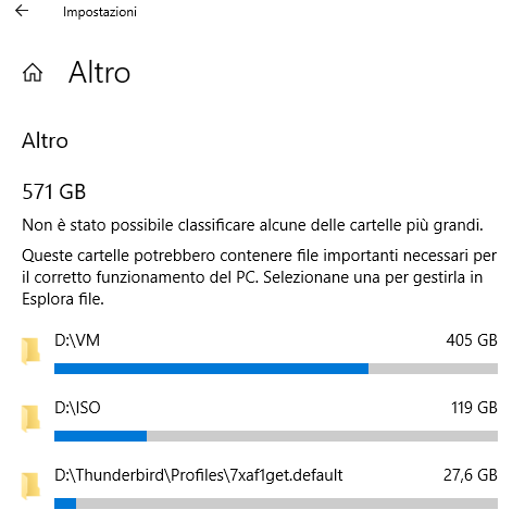 Cliccando sulla voce Altro nell’elenco la funzionalità integrata in Windows 10 indica le cartelle contenenti elementi di grandi dimensioni. Possono o meno coincidere con programmi installati.
