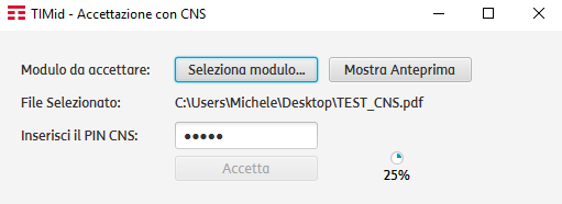 Selezionato il PDF prelevato da TIMid e introdotto il codice PIN corretto della propria CNS, si otterrà un file firmato digitalmente che dovrà essere reinviato a TIM premendo il pulsante Sfoglia sul sito (il file da inviare è il PDF con suffisso -signed-pades-baseline-b).