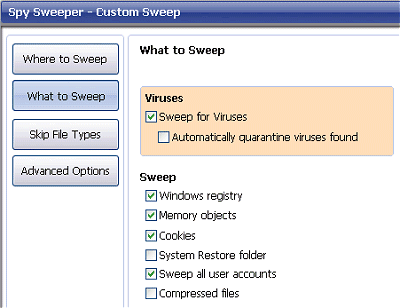 Dalla scheda Sweep, cliccando sul link Change settings, è possibile comunicare a Spy Sweeper quali aree del sistema debbano essere prese in esame e se debba essere attivata anche la scansione antirootkit (pulsante Advanced options).