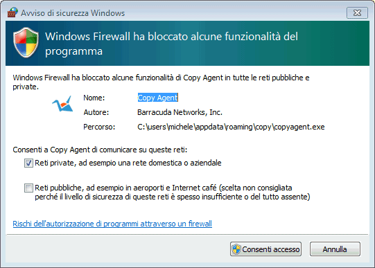 Per le attività di sincronizzazione dei file, Copy attiva delle funzionalità server che necessitano la regolazione del firewall di Windows come in figura: